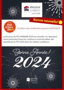 Notre partenaire financier continue de monter les dossiers de financement avec le Prêt à Taux Zéro 2023 dans les mêmes conditions.