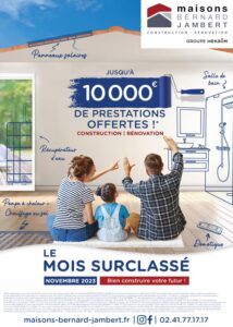 Offre valable pour tous les contrats de construction de maison signés avec la société MAISONS BERNARD JAMBERT entre le 6 novembre et le 5 décembre 2023, sous réserve de la bonne réalisation des conditions suspensives et de l’application de la tarification en vigueur au 1er avril 2023. Chaque client peut bénéficier jusqu’à 10 000€ TTC de prestations complémentaires offertes selon le montant TTC de son contrat de construction ou de rénovation, avenants à la mise au point technique inclus et hors indexation. Pour tout contrat d’un montant compris entre 100 000€ TTC et 149 999€ TTC, les prestations sont offertes à hauteur de de 2 500€ TTC. Pour tout contrat d’un montant compris entre 150 000€ TTC et 199 999€ TTC, les prestations sont offertes à hauteur de 5 000€ TTC. Pour tout contrat d’un montant compris entre 200 000€ TTC et 249 999€ TTC, les prestations sont offertes à hauteur de 7 500€ TTC. Pour tout contrat supérieur ou égal à 250 000€ TTC, les prestations sont offertes à hauteur de 10 000€ TTC. Seules les prestations référencées chez Maison Bernard Jambert pourront être retenues. Le choix des prestations n’est pas limité en nombre, seule la valeur cumulée des prestations ne doit pas dépasser 10 000€ TTC pour tout contrat d’un montant initial minimum de 250 000€, 7 500€ TTC pour tout contrat initial minimum de 200 000€ TTC, 5 000€ TTC pour tout contrat initial minimum de 150 000€ TTC et 2 500€ TTC pour tout contrat initial minimum de 100 000€ TTC. Offre disponible dans les agences participantes à l’opération. Offre non cumulable avec d’autres promotions en cours. Pour plus de renseignements, voir conditions dans les agences Maisons Bernard Jambert ou sur le site maisons-bernard-jambert.com – Photos non contractuelles, image de synthèse HEXAOM, crédit photos HEXAOM, Adobe Stock (1) HEXAOM SA – 2 route d’Ancinnes – BP 70017 – 61001 ALENCON / SA AU CAPITAL DE 1 250 000€ / SIRET 095 720 314 00012 / RCS ALENCON B 095 720 314.