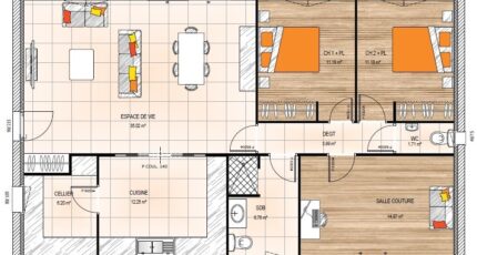Réalisons ensemble votre maison de plain-pied comprenant deux chambres et une salle de couture pouvant se transformer en troisième chambres. Découvrez une belle pièce de vie, une cuisine indépendante, un cellier et une salle de bain spacieuse.