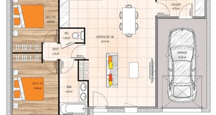 Votre constructeur Maisons Bernard JAMBERT vous propose un avant-projet réalisé pour un couple de séniors. Cette maison de plain-pied de 67 m² habitable, au style traditionnel, se compose d'une pièce de vie de 34 m² traversante avec une cuisine ouverte donnant sur jardin. Le côté nuit est organisé autour de 2 chambres d'environ 10 m², une salle de bain. Une zone de rangement est également prévue avec un cellier et un garage.