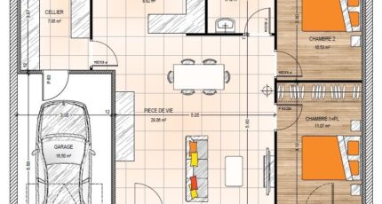 Votre constructeur Maisons Bernard JAMBERT vous propose un avant-projet de maison de plain-pied de 72 m² habitable, au style traditionnel. Elle se compose d'une pièce de vie de 38 m² traversante avec une cuisine donnant sur le jardin et la terrasse. Le côté nuit est organisé autour de 2 chambres d'environ 11 m², une salle de bain. Une zone de rangement est également prévue avec un cellier et un garage.