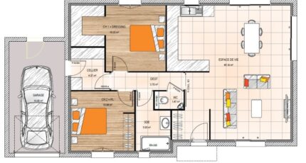 Votre constructeur Maisons Bernard JAMBERT vous propose un avant-projet réalisé pour un couple de séniors. Cette maison de plain-pied de 86 m² habitable, au style contemporain, se compose d'une pièce de vie de 45 m² traversante avec une cuisine donnant sur rue. Vous serez séduit par la luminosité et les espaces. Le côté nuit est organisé autour de 2 chambres dont une avec un dressing spacieux, une salle de bain. Une zone de rangement est également prévue avec un cellier et un garage.