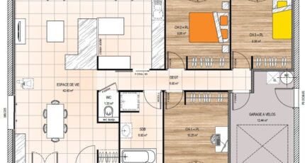 Votre constructeur Bernard Jambert vous propose un projet de maison plain-pied étudié et réalisé pour un jeune couple. Une Architecture traditionnelle pour cette maison de 87 m². Vous serez séduit par cet espace de vie lumineux, cuisine moderne avec séparation d'une verrière atelier sur le salon. Espave nuit composé de 3 chambres et d'une salle de bain familiale. Particularité avec garage à vélo de 12m².
