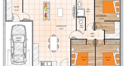 Les Maisons Bernard Jambert vous proposent un avant projet dessiné pour un jeune couple. Ce plain-pied de 89 m² habitables a une organisation intérieure optimisée. Une pièce de vie de 41 m² très lumineuse grâce à ces ouvertures, un cellier donnant sur un garage confortable et 3 chambres spacieuses.