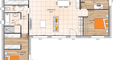 Très jolie architecture de plain-pied à vous proposer pour votre projet de construction personnalisé: pièce de vie agréable de 45m², cellier, bureau votre espace travail, 2 chambres dont une parentale avec dressing et salle de bain familiale avec douche à l'italienne, baignoire et vasque.