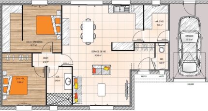Un bel avant projet réalisé pour un couple de séniors dont le terrain se situe en lotissement. Ils ont apprécié le volume de la pièce principale, sa luminosité, le cellier avec accès au garage spacieux, les deux chambres dont une avec un dressing, le rêve de madame. Cette maison a une surface habitable de 84 m² .
