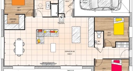 Un plain-pied très contemporain avec son toit mono pente. Vous apprécierez la pièce de vie de plus de 54 m² avec ses nombreuses ouvertures. Vous disposerez d'une suite parentale et de deux chambres supplémentaires. Le garage est accessible via la buanderie. En option, vous aurez la possibilité de choisir un habillage de façade totalement différent. A vous de choisir !