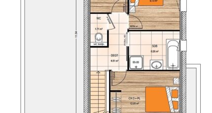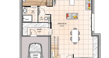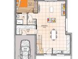 Votre constructeur Maisons Bernard JAMBERT vous propose un avant-projet réalisé pour un jeune couple. Cette maison à étage de 114 m² habitable, au style contemporain, se compose d'une pièce de vie de 45 m² traversante avec une cuisine donnant sur le jardin et terrasse, une chambre avec sa SDE. Vous serez séduit par la luminosité et l'agencement des espaces. Le côté nuit est organisé autour de chambres d'environ 11 m², un bureau et une salle de bain. Une zone de rangement est également prévue avec un cellier et un garage.